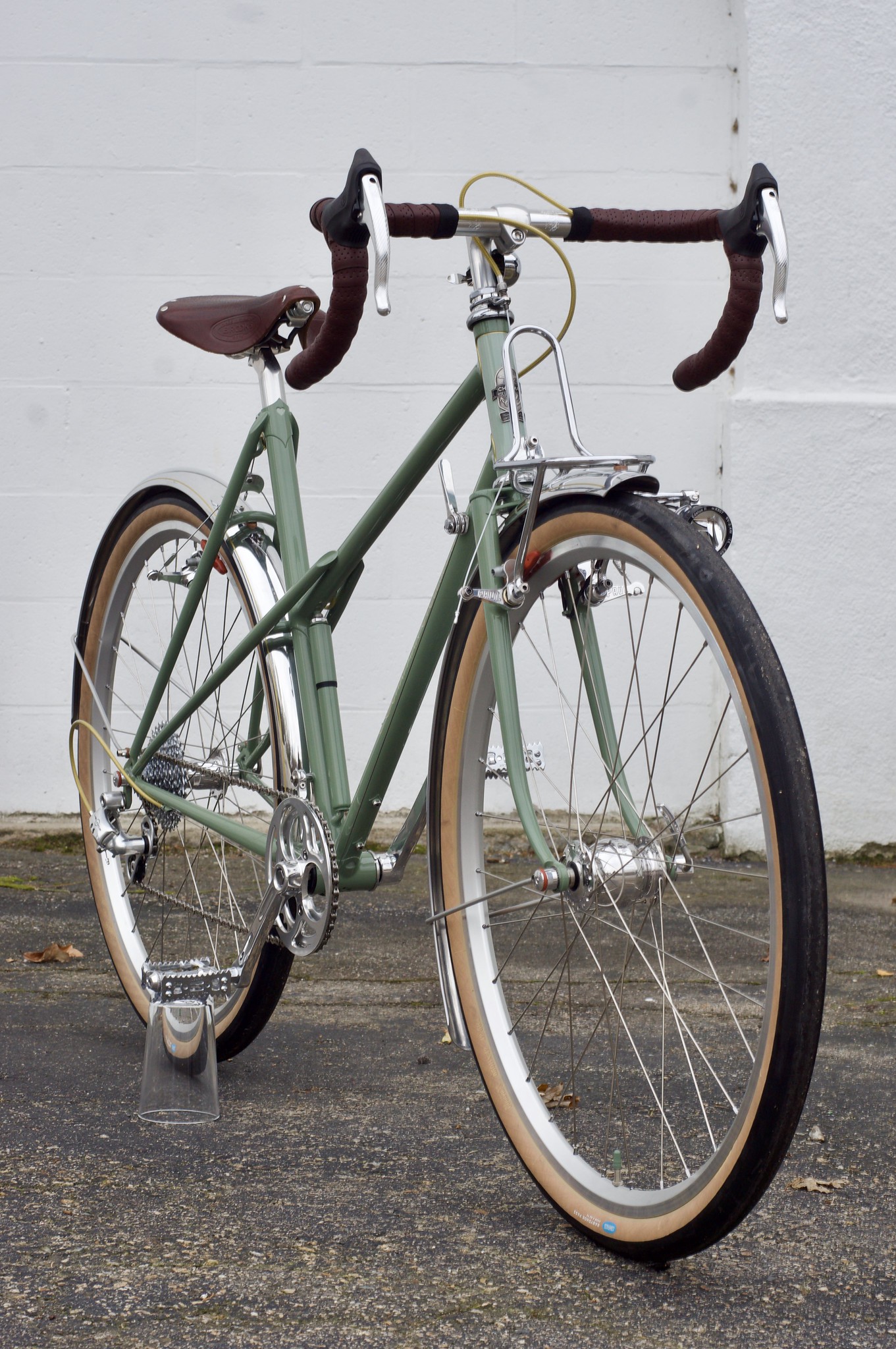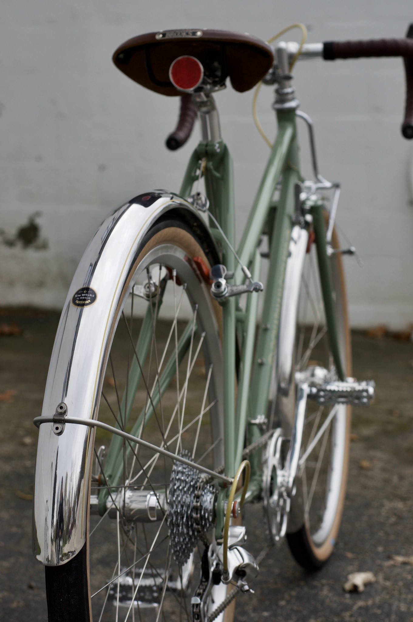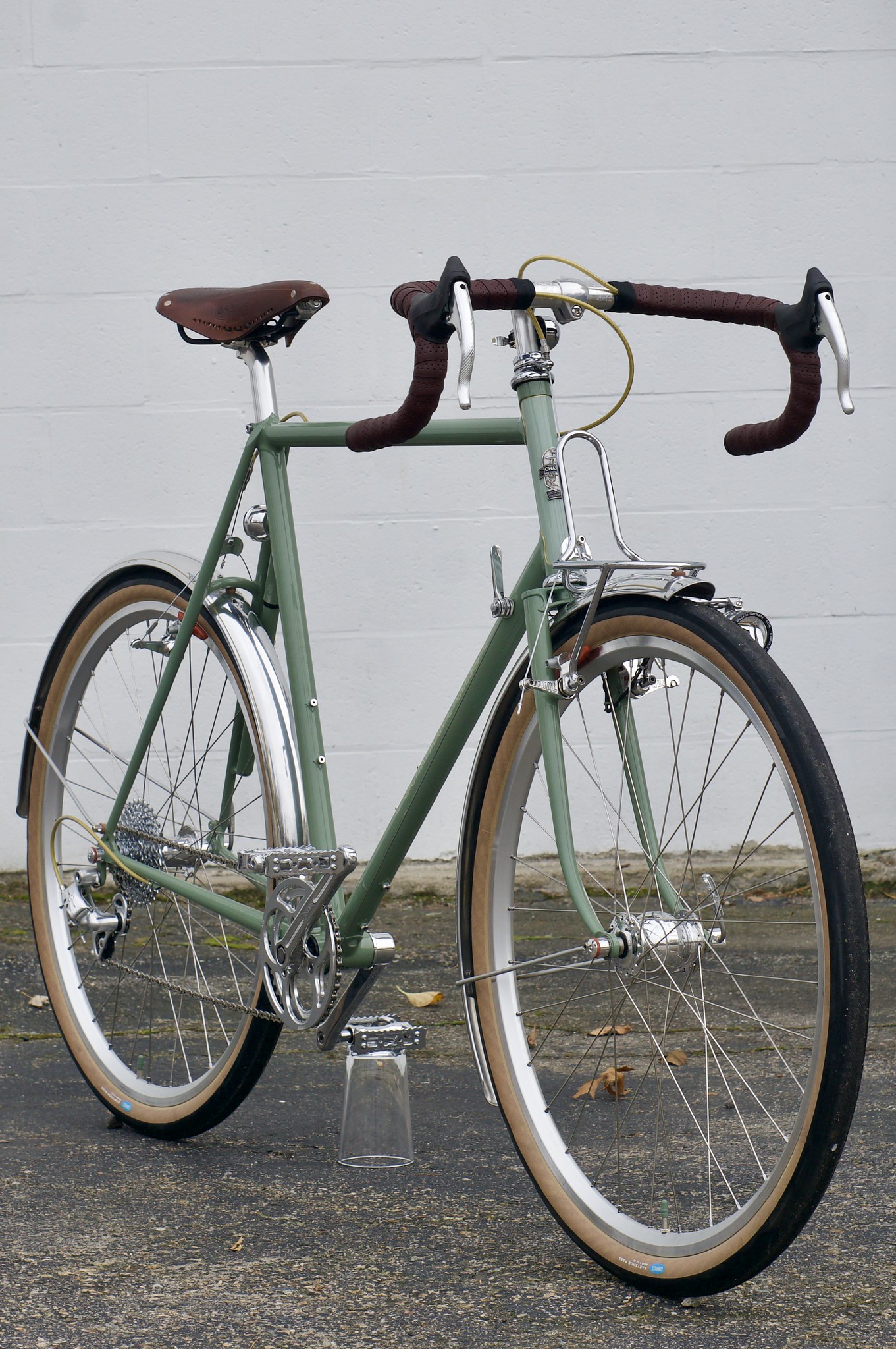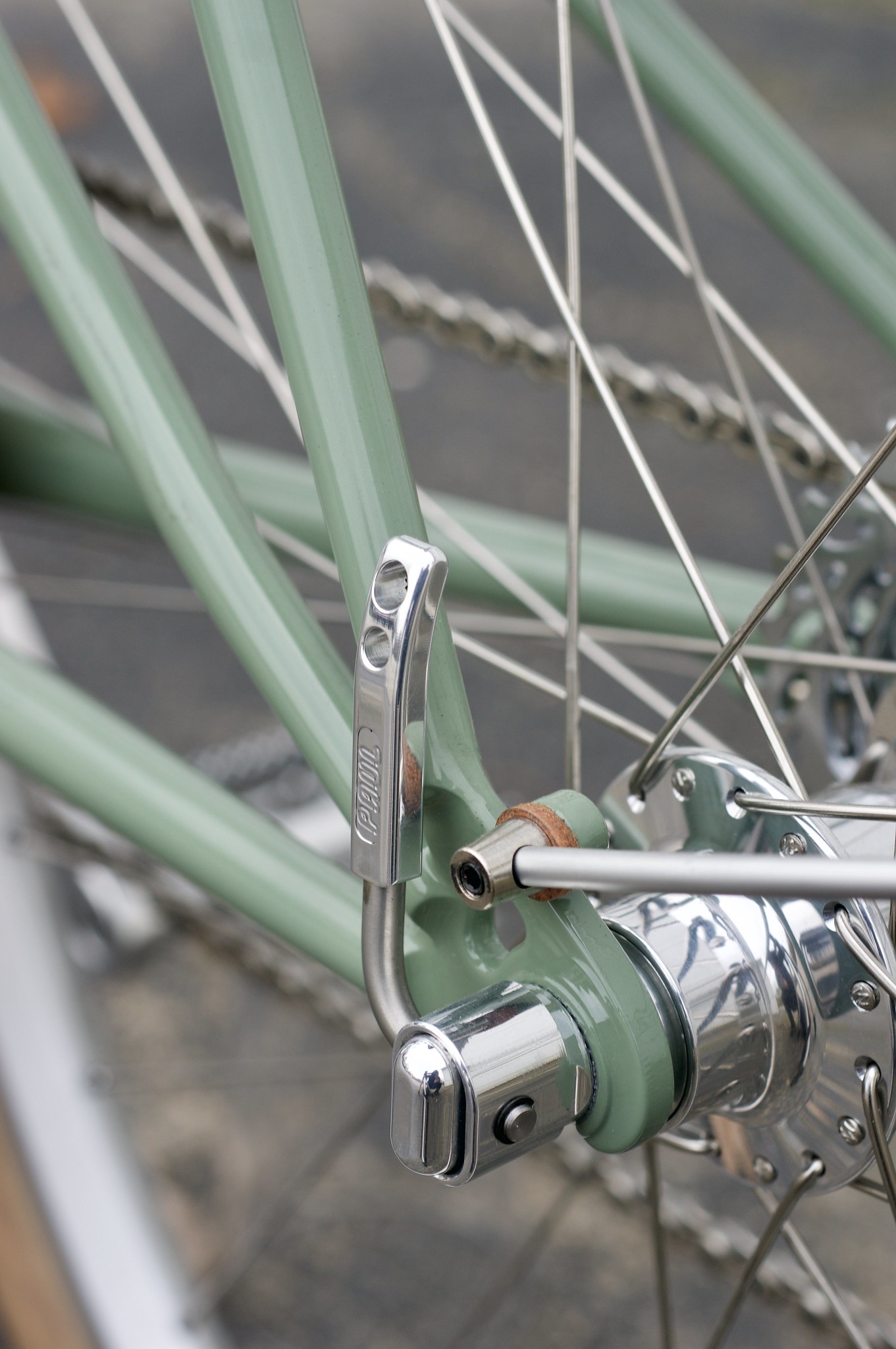The style of bike is essentially a 1×10 city bike/commuter. No aggressive hill climbing but a wide range 10-speed cassette allows them to navigate the city easily. For the single chainring crankset up front, I removed the teeth from a Rene Herse chainring to create a chain guard on the outside. The extra Campagnolo shift lever was modified to act as a chain catcher. Both bikes had Campagnolo drivetrains with Rene Herse cranksets, Schmidt dynamos with SL connector-less dropouts, front and rear lighting, custom racks, Paul Component brakes/skewers, and matching custom Brooks saddles (thank you Simon at Transport Cycles in Philly!).
